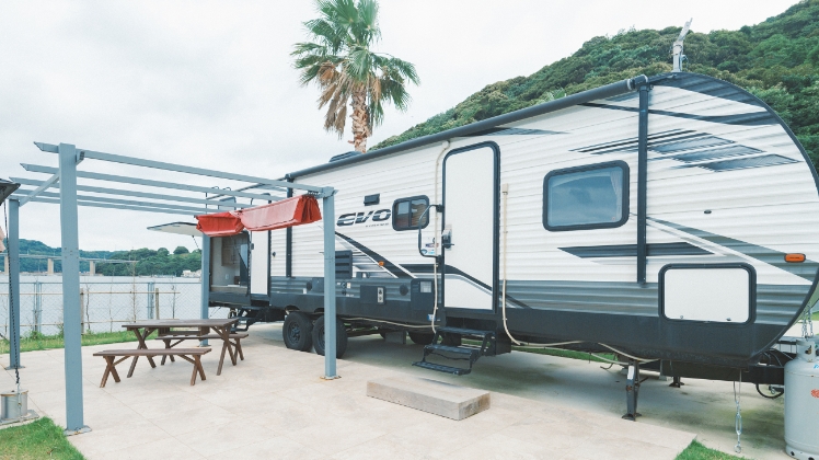 アメリカから直輸入した大型トレーラーハウスを12台設置。ホテル並みの設備を備えたトレーラーなので、手ぶらでキャンプをお楽しみいただけます。室内はキッチン、トイレ、シャワー、ベッドルーム、冷暖房を備え、非日常の空間でアウトドア気分を満喫できます。ペットと一緒に泊まれるトレーラーもご用意しています。